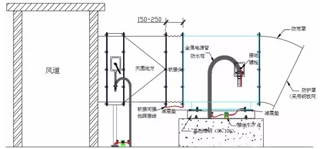 4、在電源管處預(yù)埋一根40x4接地扁鋼,在金屬風(fēng)管軟接處采用≥4mm2軟線或銅編織帶及時(shí)做好接地跨接。